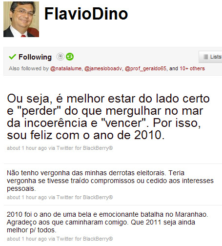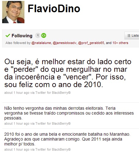 “Não tenho vergonha das minhas derrotas eleitorais. Teria vergonha se tivesse traído compromissos ou cedido aos interesses pessoais. Ou seja, é melhor estar do lado certo e “perder” do que mergulhar no mar da incoerência e “vencer”. Por isso, sou feliz com o ano de 2010”, declarou Flávio.